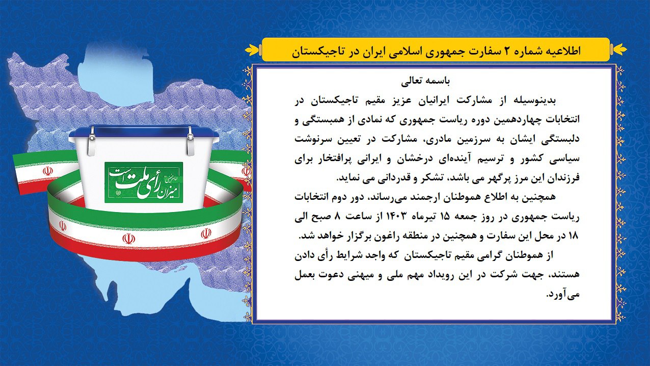 حضور هموطنان عزیز و مشارکت آنها در چهاردهمین دور انتخابات ریاست جمهوری را روز جمعه 15 تیر 1403 ساعت 8 صبح در محل سفارت جمهوری اسلامی ایران در شهر دوشنبه و منطقه راغون گرامی می داریم.