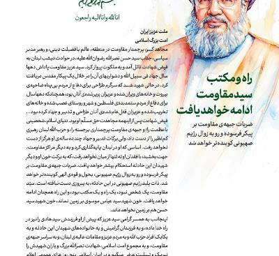 Муҷоҳиди кабир, парчамбардори муқовимат дар минтақа, донишманди дорои фазилати динӣ ва раҳбари мудаббири сиёсӣ, ҷаноби Сайид Ҳасан Насруллоҳ (р), дар ҳодисаҳои шаби гузашта дар Лубнон ба файзи шаҳодат ноил омад ва ба малакут парвоз кард. Сайиди азизи муқовимат подоши даҳҳо соли ҷиҳод дар роҳи Худо ва душвориҳои онро дар рафти муборизаи муқаддас дарёфт кард. Ӯ дар ҳоле шаҳид шуд, ки саргарми тарроҳӣ барои дифоъ аз мардуми бепаноҳи Зоҳияи Берут ва хонаҳои харобшуда ва азизони парпаршудаи онон буд, ҳамчунон, ки даҳҳо сол барои дифоъ аз мардуми ситамдидаи Фаластин ва шаҳру рустои ишғолшуда ва хонаҳои харобашуда ва азизони қатли ом шудаи онон тарроҳӣ ва тадбиру ҷиҳод карда буд. Неъмати шаҳодат пас аз ин ҳама муҷоҳидат ҳаққи мусаллами ӯ буд.